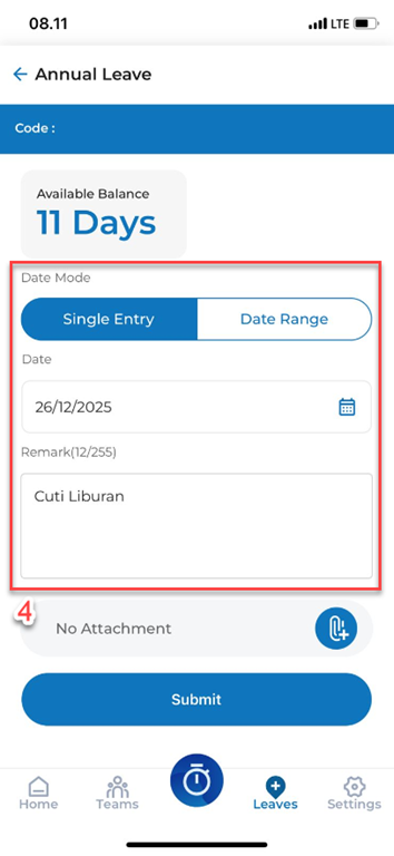 a. Date Mode : pilih mau CUTI satu hari atau lebih, jika 1 hari bisa memilih Single Entry