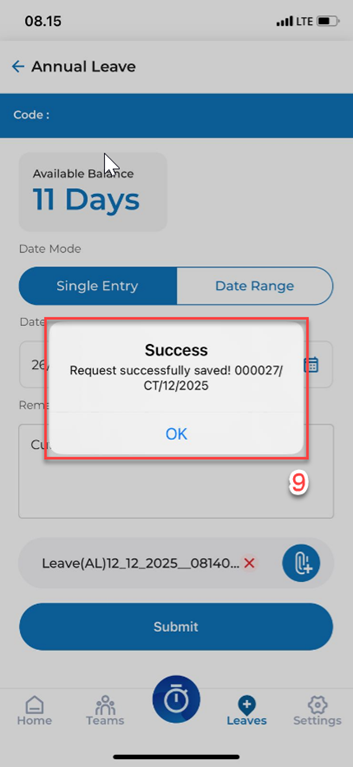9. Klik OK dan terdapat pemberitahuan bahwa CUTI yang diajukan sudah sukses.