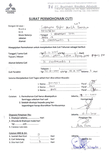 Note : ada beberapa pilihan ada menu ini bisa disesuaikan dengan form yang ingin diajukan, jika ingin mengajukan Annual Leave, Special Leave, Permit In the middle (masuk siang/pulang cepet) Permit 1 day (untuk izin 1 hari yg belum punya hak cuti) bisa disesuaikan.